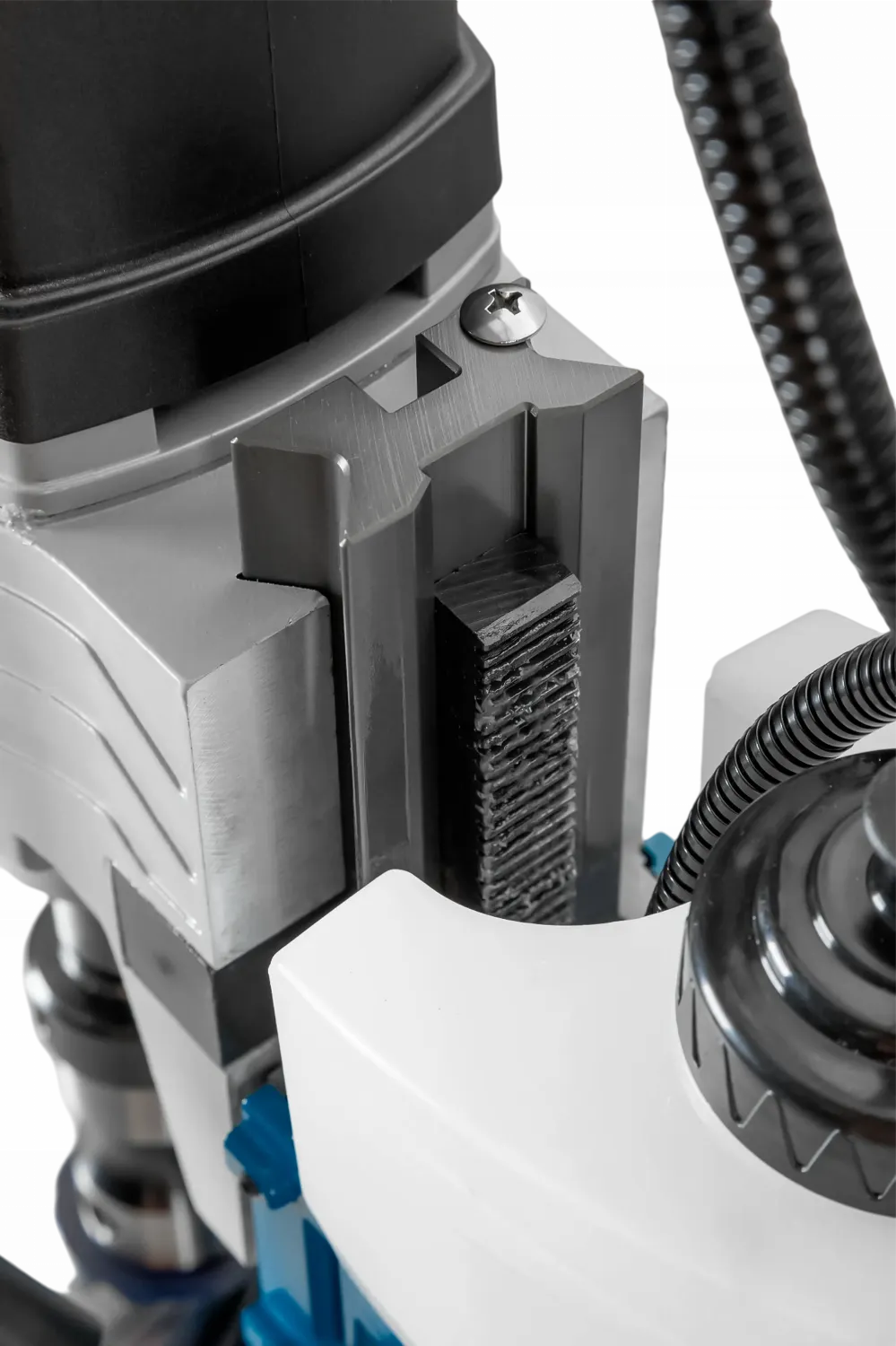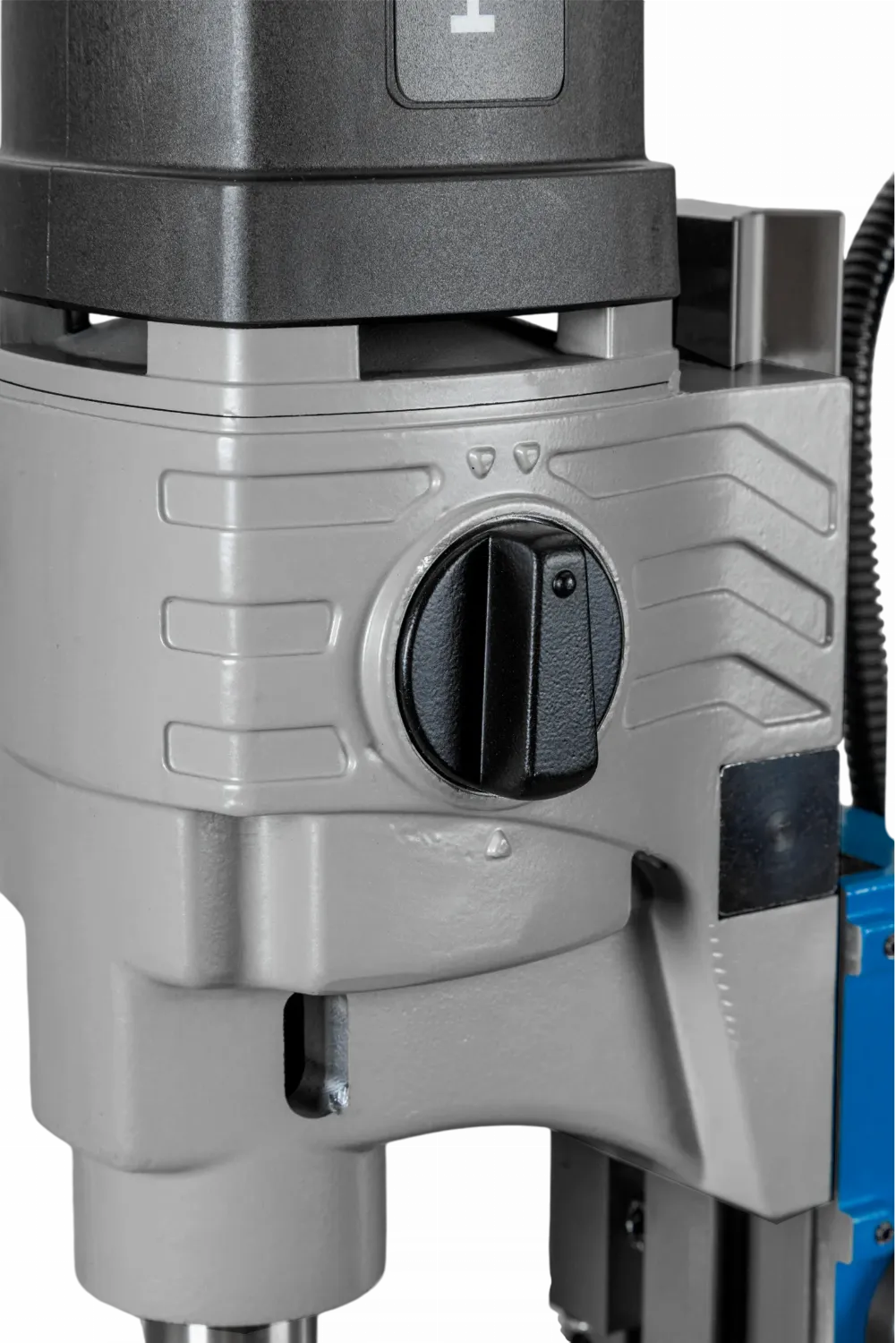 - Направляющие типа «двойной ласточкин хвост» позволяют перемещать и закреплять привод в любом положении для работы с длинными спиральными сверлами или сверления ниже уровня основания станка.