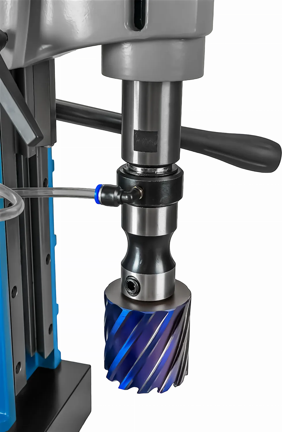 - Износостойкие направляющие «двойной ласточкин хвост» позволяют регулировать положение привода для работы длинными сверлами или сверления ниже базовой поверхности станка.