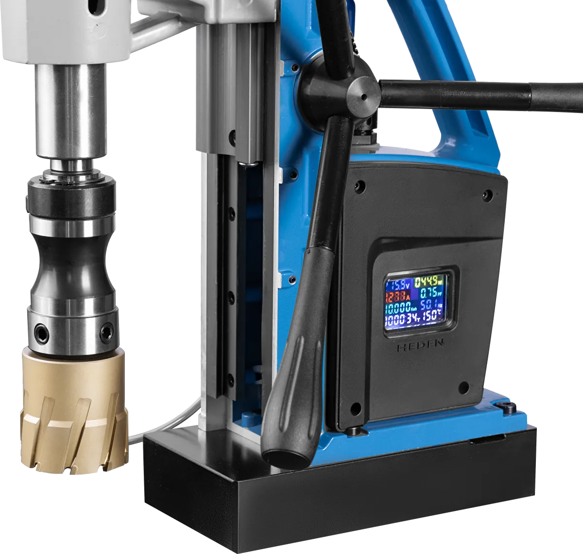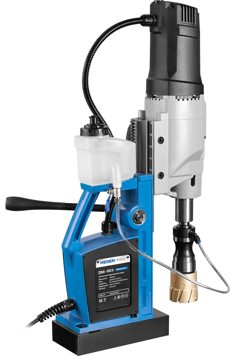 Выполняет сверление корончатыми сверлами до Ø65 мм и спиральными сверлами до Ø25 мм. Надежно фиксируется на горизонтальных стальных поверхностях благодаря мощной магнитной основе.