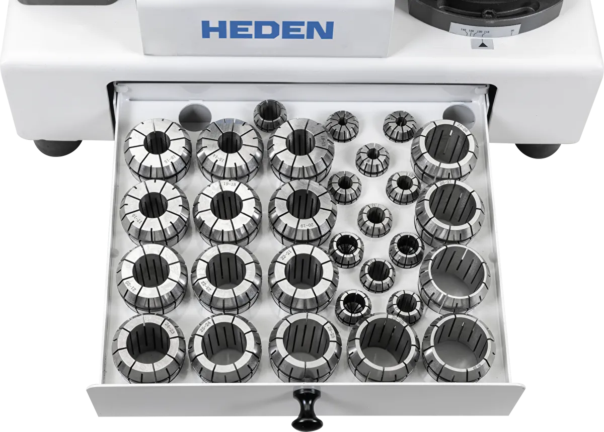 - Компактная конструкция со встроенным ящиком для хранения цанг.