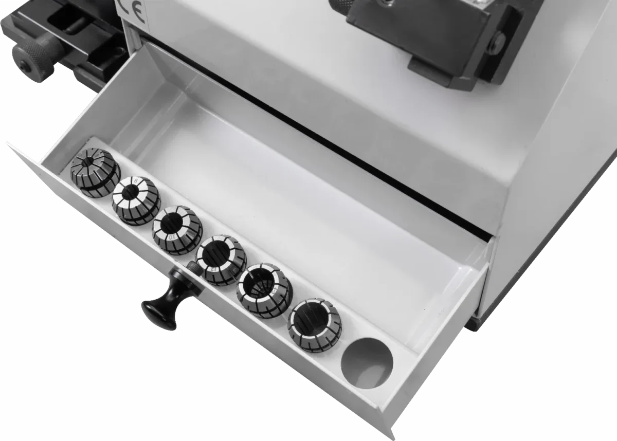 - Компактная конструкция со встроенным ящиком для хранения цанг.
